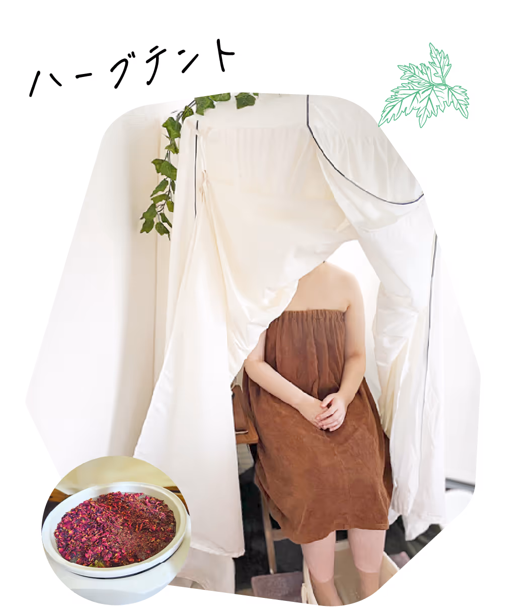 タイ由来の伝統療法、ハーブテント(スチームサウナ)。煮出した蒸気を浴びることで皮膚から毛細血管、鼻から大脳、呼吸器から肺へとハーブの成分を取り込み、子宮をはじめとする体内をゆっくりと温めていきます。